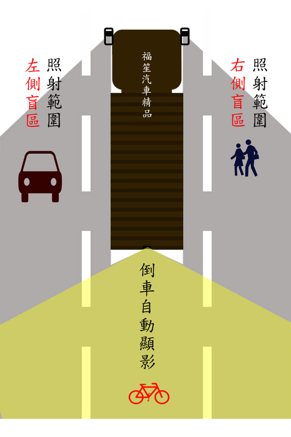 交通部新修規定大型車輛需安裝【行車視野輔助系統】 行車視野輔助系統規定: 1.應於車身兩側以及後方至少各裝設乙具攝影鏡頭,且須具備影像紀錄功能。 2.系統解析度不得低於二十七萬像素,鏡頭角度至少為120度或更寬,感光元件應至少1/3"CCD或更高規格。(PS:本店產品高達一百三十萬像素。 ) 3.系統應由車輛本身進行供電,車輛啟動時自動開啟,且不得設置手動關閉裝置。 4.影像畫面顯示模式:可切換各鏡頭單一畫面或分割4個鏡頭之畫面,需同時具備4錄影像行車紀錄功能. 5.倒車影像之顯示應於車輛排入倒車檔後二秒內顯示,並得暫時取代車身兩側之影像顯示。 6.倒車影像應於倒車行駛其間持續顯示,車輛排檔離開倒車檔後,螢幕應自動回覆顯示車身兩側之影像。 7.車內應設置至少乙組七吋以上之顯示螢幕,且必須於駕駛座能輕易判讀。